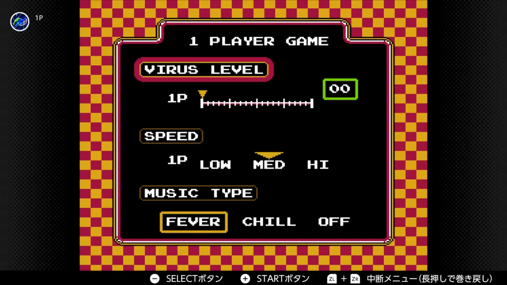 カプセルの落下速度など、ゲームスピードの選択。LOW, MED, HIの3段階から選択できる。LOWが一番遅くて、HIが一番速い。