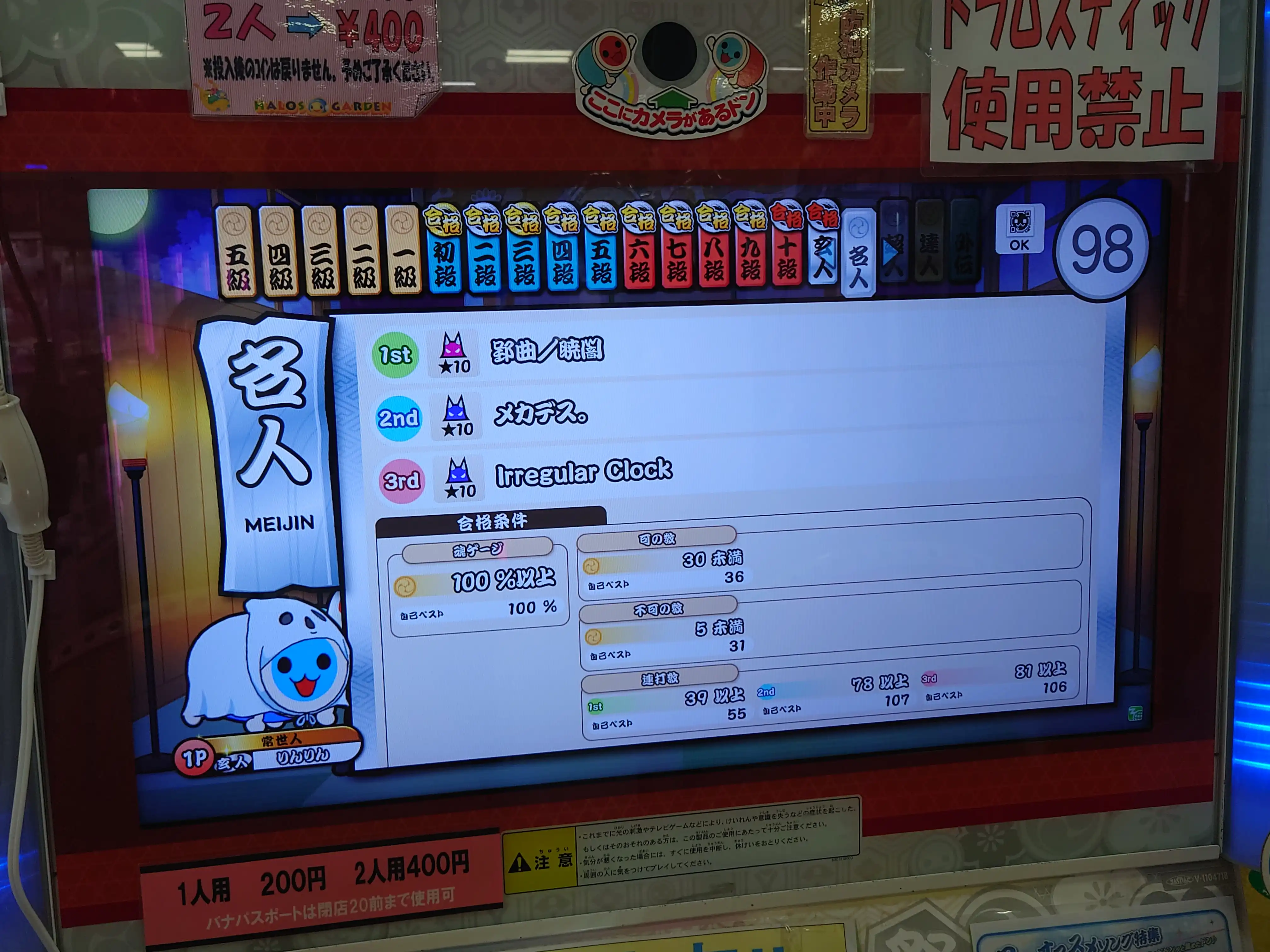 ニジイロ2023で初めて玄人になった。ついに人段位。名人に挑戦する資格を得た。 でも、課題曲の壁がとんでもなく高くて、挑戦する気にすらなれなかった (バチムチとか勇者裏とかNosferatu裏とか 誰なんですかあいつら超人3曲目の間違いなんじゃないんですか 名人のボスって言ったら燎原とかFLOWER裏じゃないんですか?????)