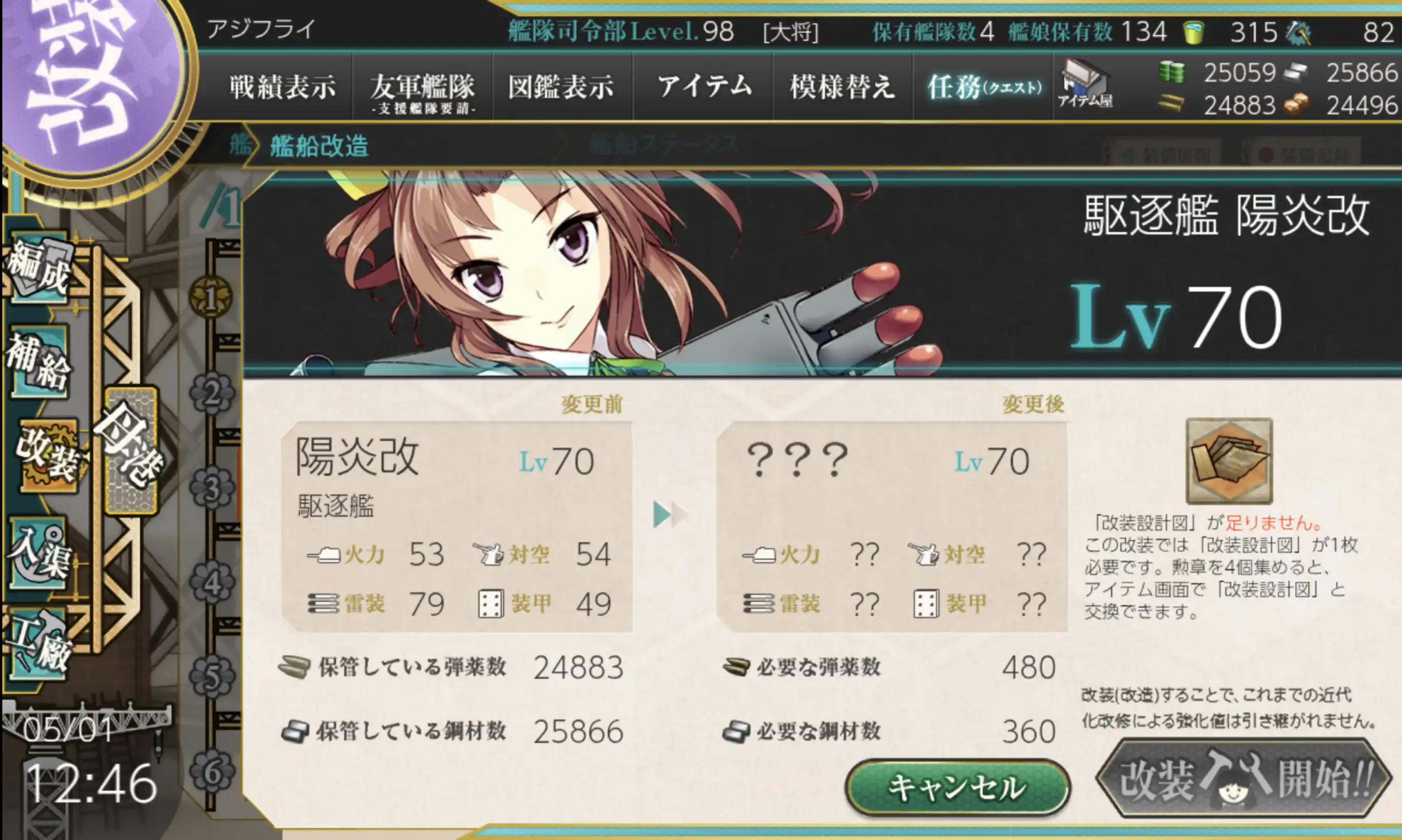 演習終わらせてからウッキウキで改装選んだらコレですよ。まじすか。改装設計図必要なんすかあなた。知らなかった。